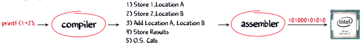 But alone assembler is not involved in this whole process; it also requires the compiler to compile the long code into a small chunk of codes. With advancement in software development languages, this entire assembly code could shrink into just one line print f 1+2 A with the help of software called COMPILER. It is used to convert your c language code into assembly code, and the assembler converts it into corresponding machine code, and this machine code will be transmitted to the processor. The most common processor used in PC or Computers are Intel processor.