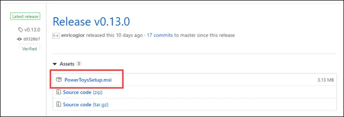 Head over to this link. There will be a few releases listed, the top one is the most recent one. Look for PowerToysSetup.msi and click on that to download the installer. If you’re interested in working with the source code, click on either Source code (zip) or Source code (tar.gz ).