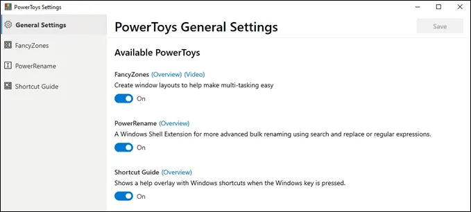 The first settings you’ll see allow you to turn on or off the individual PowerToys. On the left side of the general settings window, you can access PowerToy specific settings.