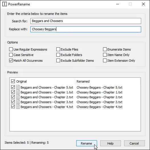 In the image below, you can see how simple it would be to rename all the files in a series of chapters of a book.
