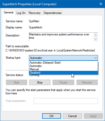 Step 3: Prevent Superfetch from running automatically. Still in the Services app, right-click on Superfetch and select Properties . Under the General tab, look for Startup type and change it to Disabled . (Or Manual if you’d like the option to turn it on when you need it.)