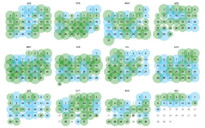 - Clicking on any of the years in this timeline will bring you to a page with a bubble chart calendar to help visualize all of the page’s saved data for that year.