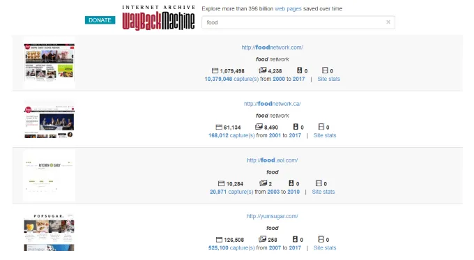 - Searching by keyword will show a list of results by domain name, as well as the number of captures, or snapshots, for each.