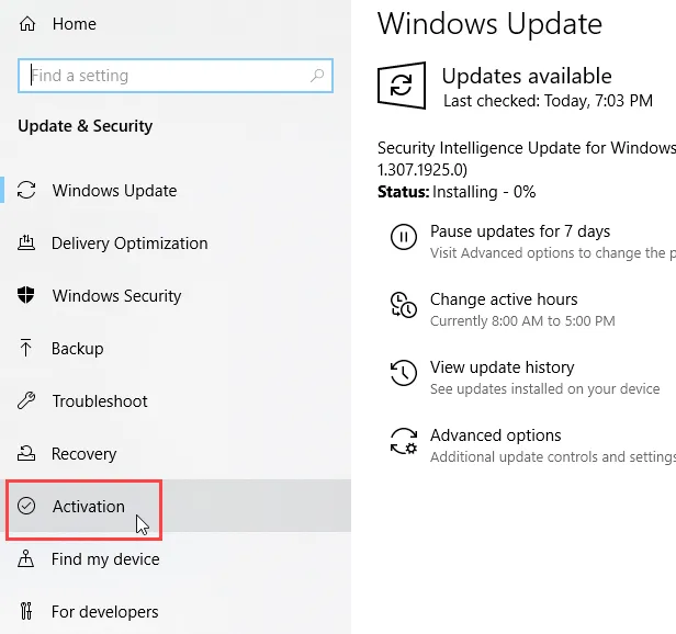 In the Update window, click on Activation on the left-hand side.