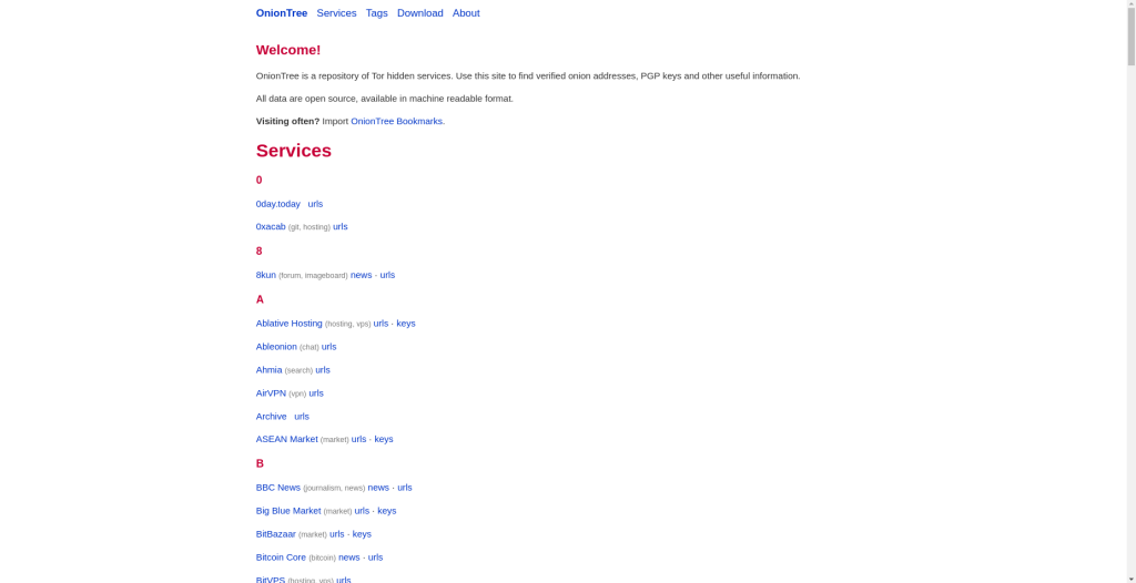 A site that I had not mentioned in earlier posts is OnionTree, which is available from the clearnet and is a repository of PGP-verified onion services. As opposed to a site like Fresh Onions, OnionTree makes an effort to remain scam- and phishing-free through not just the PGP keys, but also fingerprint IDs and official user IDs of the site owners.