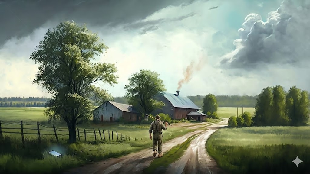 You wake up. No alarm. You walk outside and the air smells like wet grass and woodsmoke. You spend the morning drawing or printing books — the work that pays. In the afternoon, you hoe a field. The rhythm is slow. You can talk while you work. You and your dad discuss the news, or history, or nothing. Your neighbor stops by. A robin watches from the fence. By evening, you light a fire, cook potatoes you dug up an hour ago, and drink cider you pressed last autumn. You sit. You’re not stressed — because you’re not paying for any of it. You did the work. Now you’re enjoying it. The cycle is closed. The day is done.