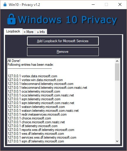 Win10 Privacy user interface reminds of the now-defunct DWS (Destroy Windows Spying) tool. Basically it allows you to do two things – add Microsoft domains to the HOSTS file to block them and remove the Microsoft apps that come pre-installed with Windows 10. You can switch to the Loopback tab to add all the domain names to the HOSTS file and block them. Some of the Microsoft apps and services will stop working after this. For example, you won’t be able to use Skype as it won’t be able to connect with Microsoft servers.