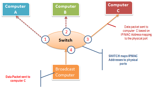 A switch works differently; it maps IP/MAC addresses to physical ports on it . Broadcast messages are sent to the physical ports that match the IP/MAC address configurations for the recipient computer. This means broadcast messages are only seen by the recipient computer. Switches operate at the data link layer (layer 2) and network layer (layer 3).