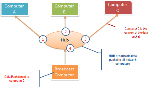 A hub works by sending broadcast messages to all output ports on it except the one that has sent the broadcast . The recipient computer responds to the broadcast message if the IP address matches. This means when using a hub, all the computers on a network can see the broadcast message. It operates at the physical layer (layer 1) of the OSI Model.