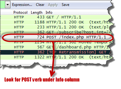 - Locate the Info column and look for entries with the HTTP verb POST and click on it