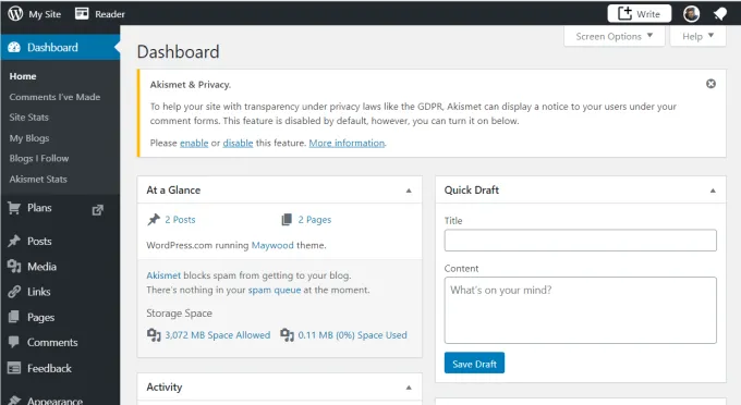 Once you access this link, you’ll see a WP Admin dashboard that’s identical to the one you would have if you’d used WordPress.com to launch your blog.