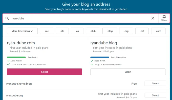 The next series of steps will walk you through creating a Title for your website, and the option to choose your site’s URL. You’ll have the option to purchase an actual domain name, or you can go with the free option, which is a URL that’s a subdomain of the home.blog parent domain.