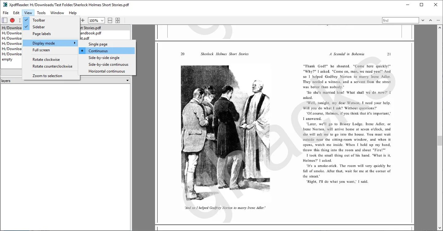 Use the File menu to open a new PDF, reload the current one or to print the document. The top left panel in XpdReader’s interface is the tabs panel, click on the “+ tab” button to open a new file. Switch between any open documents with a single click. Or, you may open multiple instances of the program by using the “Open in New Window” option. The Window menu can be used to manage open windows and tabs, for e.g. if you want to close one. The other panel on the left is for viewing layered content, bookmarks, in your PDFs.