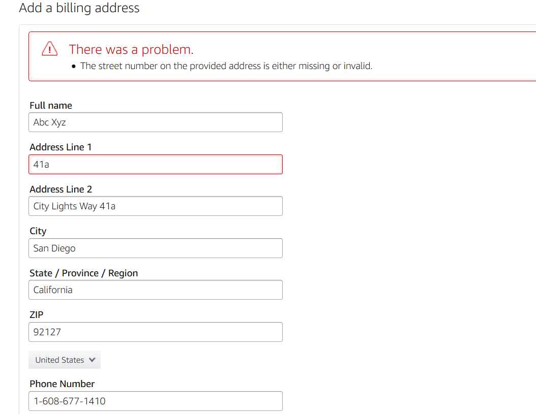 For some reason, it was not accepting any US address. Using an Indian address solved the problem.