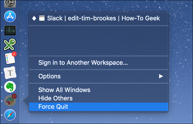 You can force quit any apps that aren’t responding or won’t close. Right-click (or two-finger click) the app’s icon, hold the Options key on your keyboard, then click “Force Quit” and the app should close. You can then try shutting down again.
